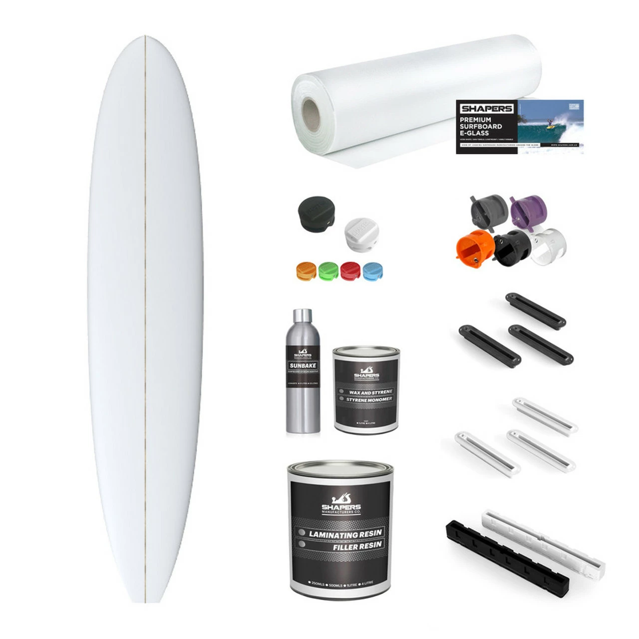 The “Blank + Material Kit” includes all the materials required to laminate, filler coat and fin system installation parts required to complete your own board. The hand picked selection of materials is the same you will find on any leading board builder! Please refer to Shaping/Glassing/Sanding Tool Kits Sections for Tools required to build your own board.